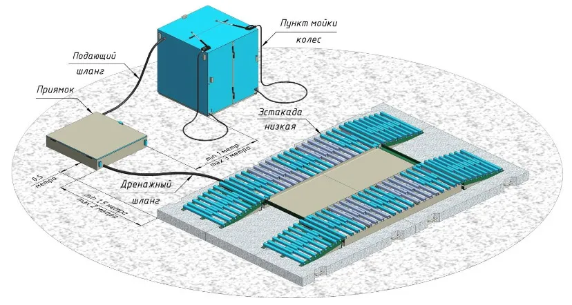 Установка оборотного водоснабжения мойки колес грузового автотранспорта предназначена для очистки колес от песка, глины, почвы и других загрязнений подобного характера при этом использованная вода очищается и возвращается на повторное использование.